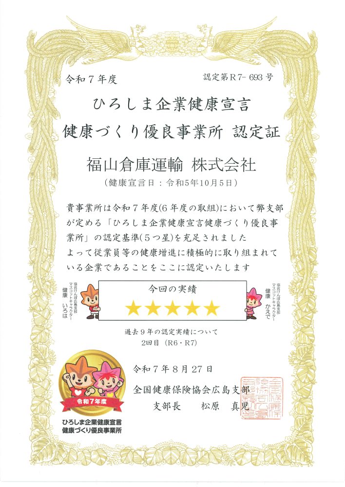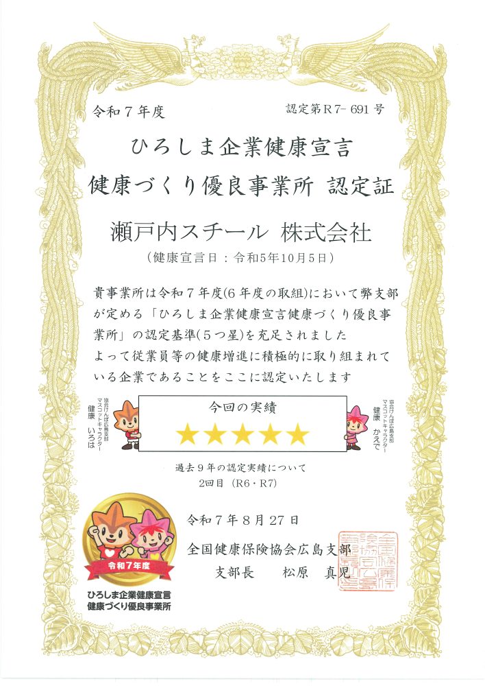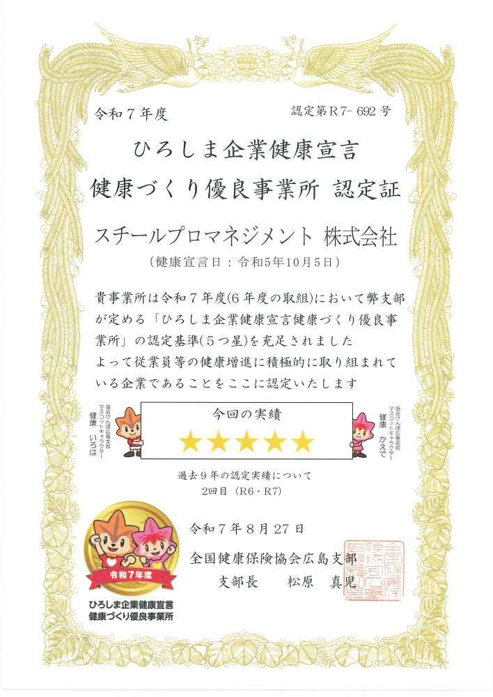 令和7年度ひろしま企業健康宣言「健康づくり優良事業場(ゴールド)」に認定されました。 投稿日: 2025年12月15日 今年度、当スチールプログループ3社の健康経営の取組が認められ、協会けんぽ広島支部様より「健康づくり優良事業所(ゴールド)」の認定を頂くことが出来ました。 今後も広島県の企業として、一層「健康経営」の取組に努めて参ります。